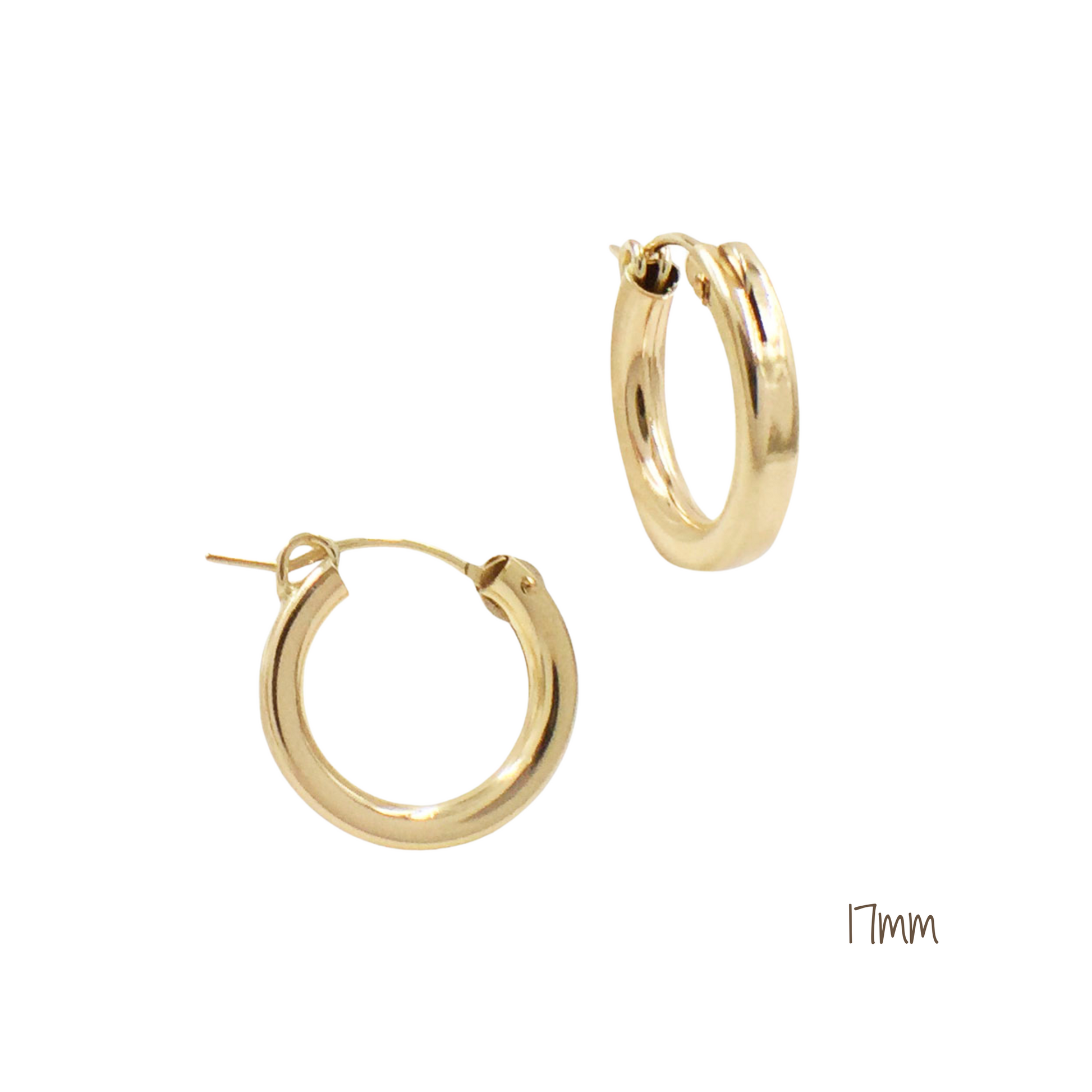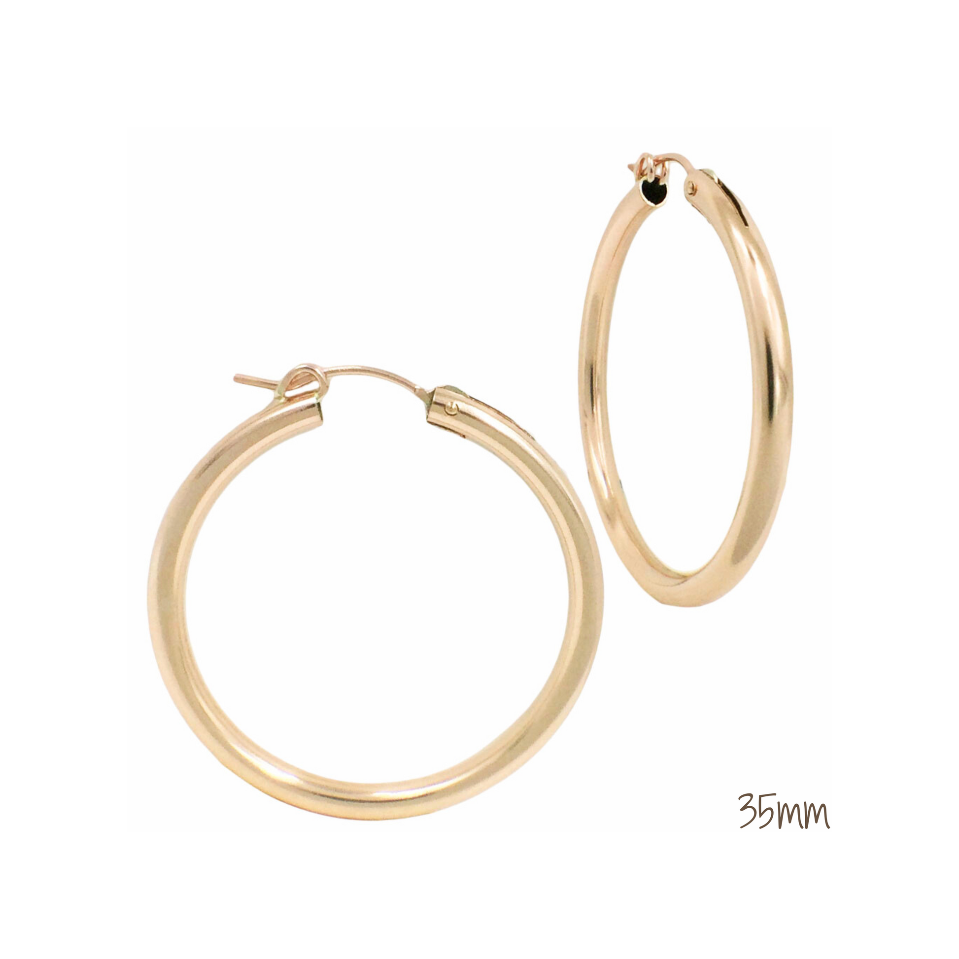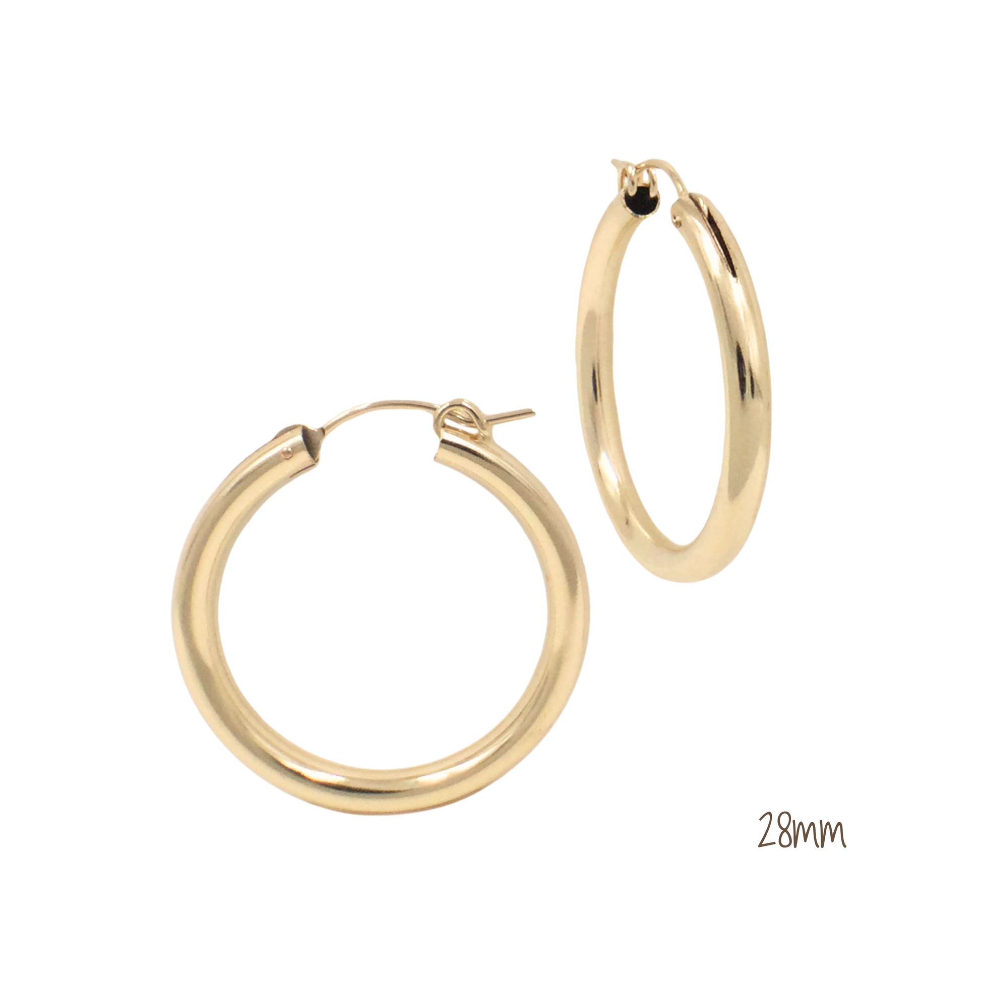 Enhance your style with these 14k gold-filled hoops, crafted from 3mm tubing for a bold yet classic look. These lightweight earrings offer a timeless design that complements any outfit. The hinged closure ensures a secure and comfortable fit, making them perfect for everyday wear and special occasions.